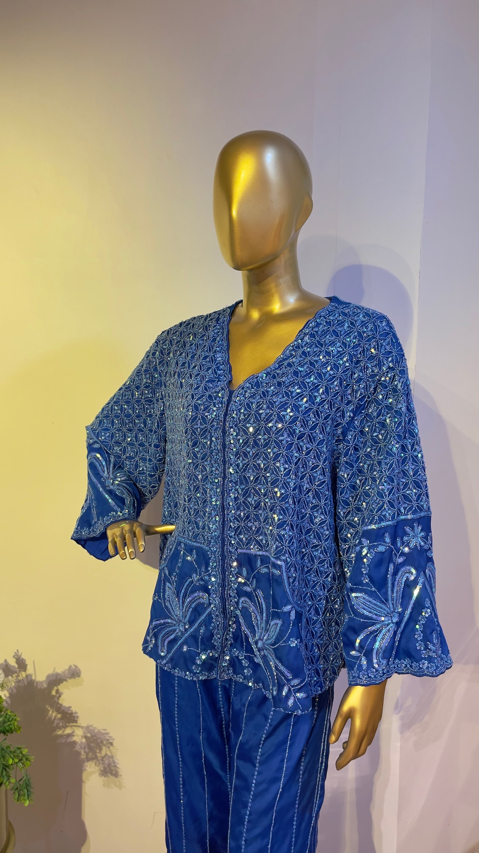 Intricately hand embroidered (front & back) electric blue coord set handcrafted in organza , is a perfect choice for any wedding festivities !