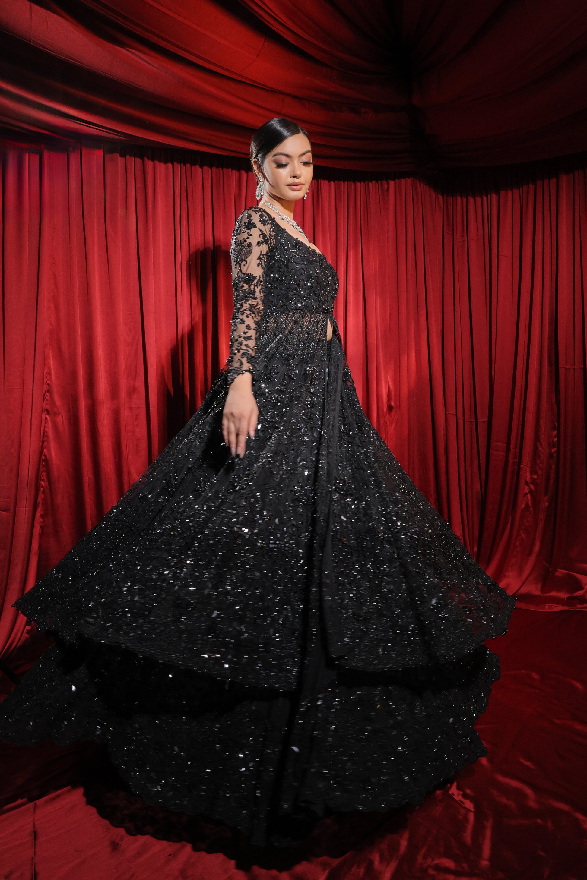 Crafted meticulously with hand-embroidered shimmering crystals, stones, and sequins, every detail sparkles with sophistication.